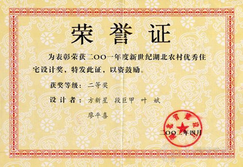 “二〇〇一年度新世紀湖北農(nóng)村優(yōu)秀住宅設(shè)計獎”榮譽證