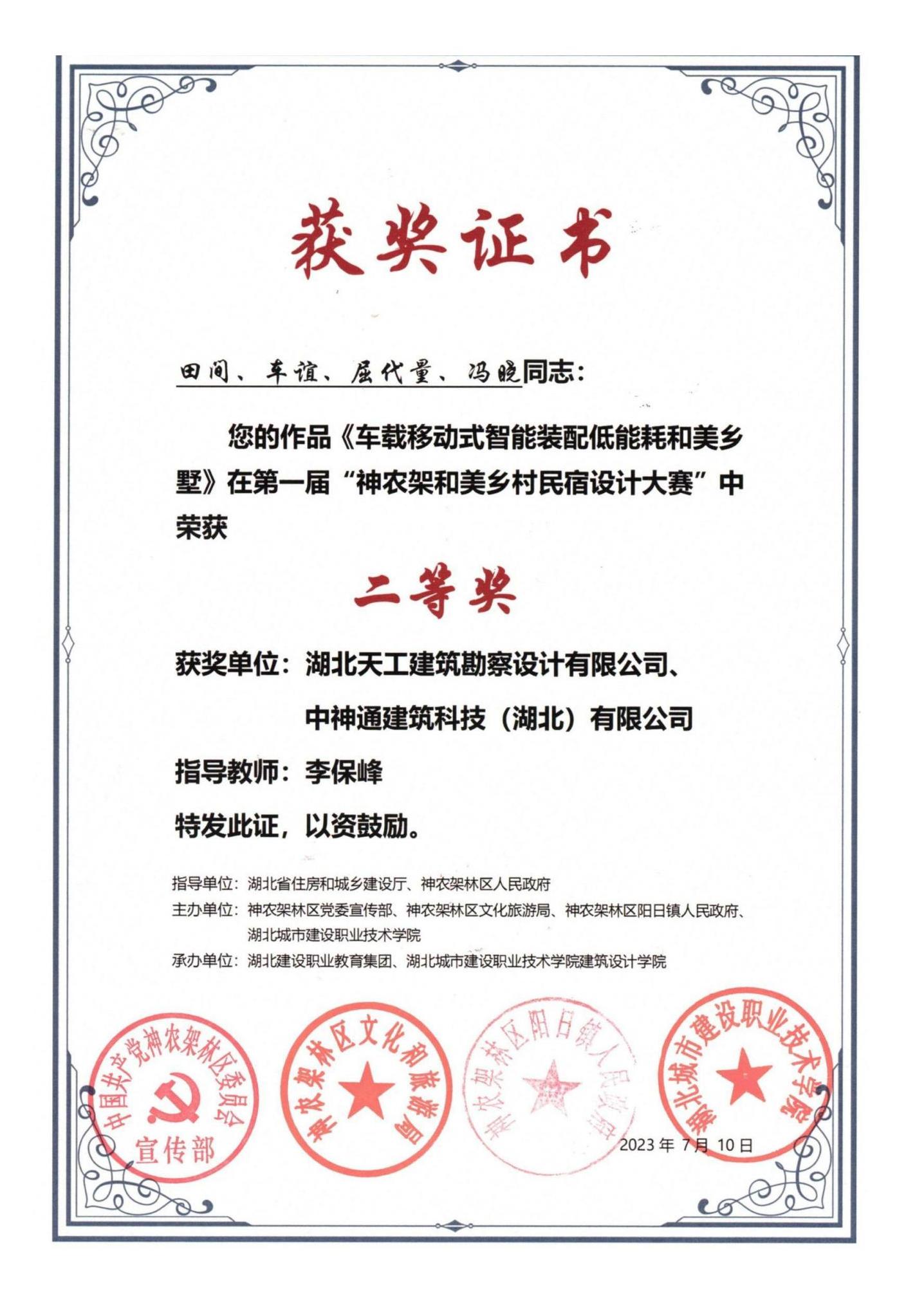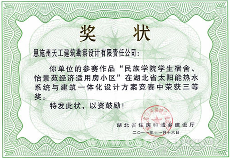 湖北省太陽能熱水系統(tǒng)與建筑一體化設(shè)計方案競賽獎狀