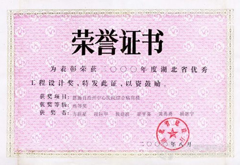 “二〇〇〇年度湖北省優(yōu)秀工程設(shè)計獎”榮譽證書