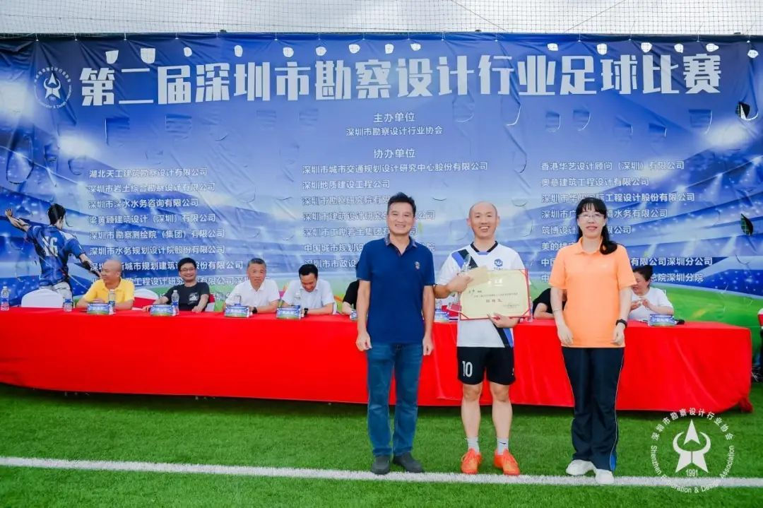 17時30分,伴隨著莊嚴(yán)的國歌,閉幕式正式開啟。廣東省工程勘察設(shè)計行業(yè)協(xié)會黨支部書記兼副秘書長羅振城,深圳市勘察設(shè)計行業(yè)協(xié)會會長,華藝設(shè)計黨委書記、總經(jīng)理陳日飆,廣東省勘察設(shè)計足球隊主教練、廣東省建筑設(shè)計研究院有限公司博士工作站指導(dǎo)導(dǎo)師李駿飛,深圳市勘察設(shè)計行業(yè)協(xié)會秘書長蔡潔、副秘書長趙秋梅,深圳市勘察設(shè)計行業(yè)協(xié)會副會長、深圳市水務(wù)規(guī)劃設(shè)計院股份有限公司副總經(jīng)理、市政工程院院長李柱,湖北天工建筑勘察設(shè)計有限公司深圳辦事處總經(jīng)理楊子江,深圳市深水水務(wù)咨詢有限公司副總經(jīng)理武海軍,深圳市廣匯源環(huán)境水務(wù)有限公司副董事長張德高等行業(yè)領(lǐng)導(dǎo)親臨現(xiàn)場并為獲獎隊伍和球員頒獎。
