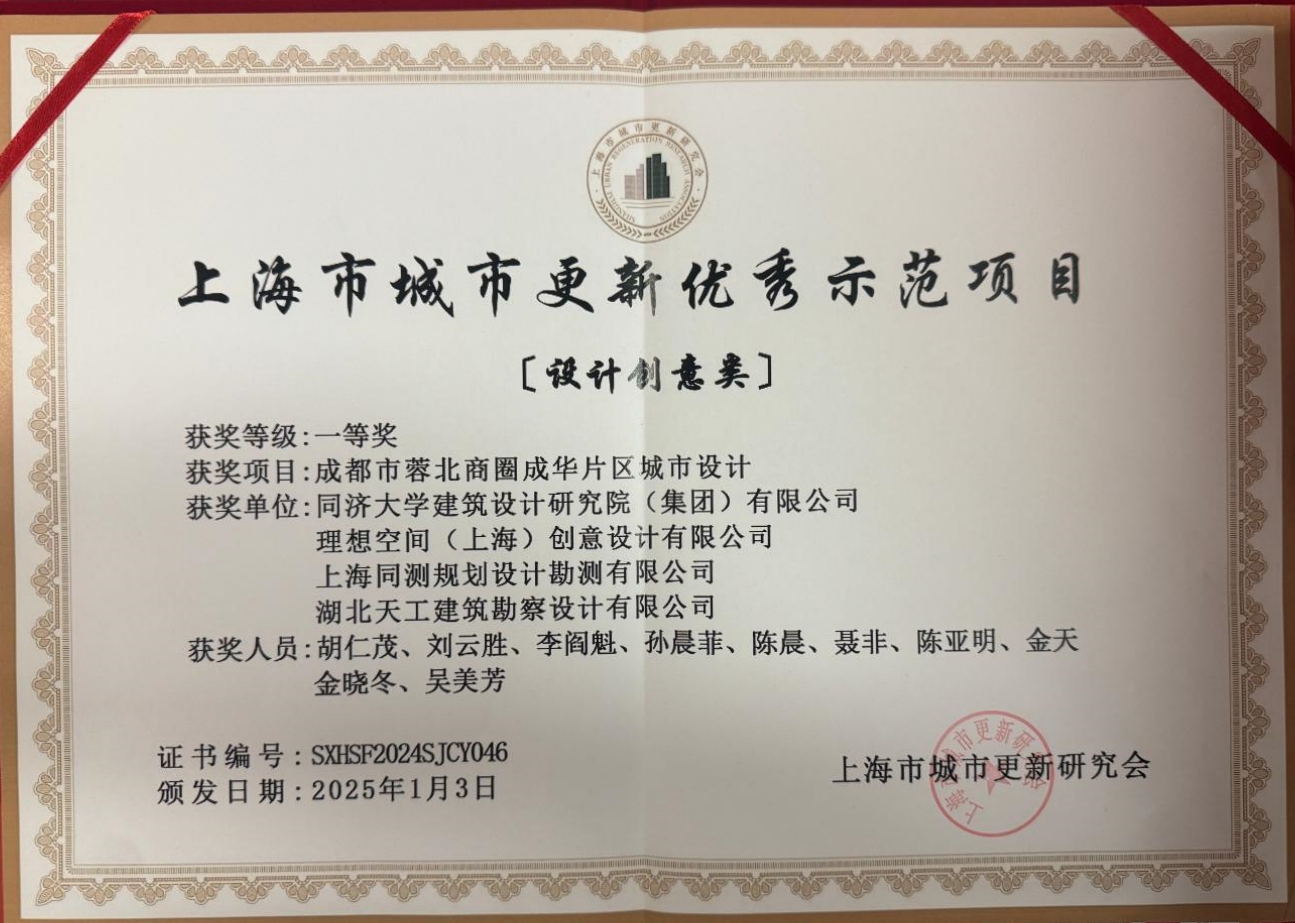 天工院聯(lián)合同濟(jì)大學(xué)建筑設(shè)計研究院(集團(tuán))有限公司、理想空間(上海)創(chuàng)意設(shè)計有限公司、上海同測規(guī)劃設(shè)計勘測有限公司設(shè)計的成都市蓉北商圈成華片區(qū)城市設(shè)計項目獲上海市城市更新優(yōu)秀示范項目(設(shè)計創(chuàng)意類)一等獎。