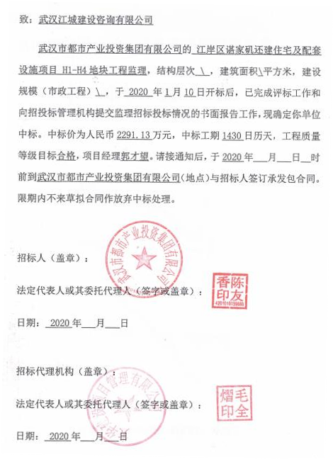 江岸區(qū)諶家磯還建住宅及配套設(shè)施項目 H1-H4 地塊工程監(jiān)理 項目中標(biāo)通知書: